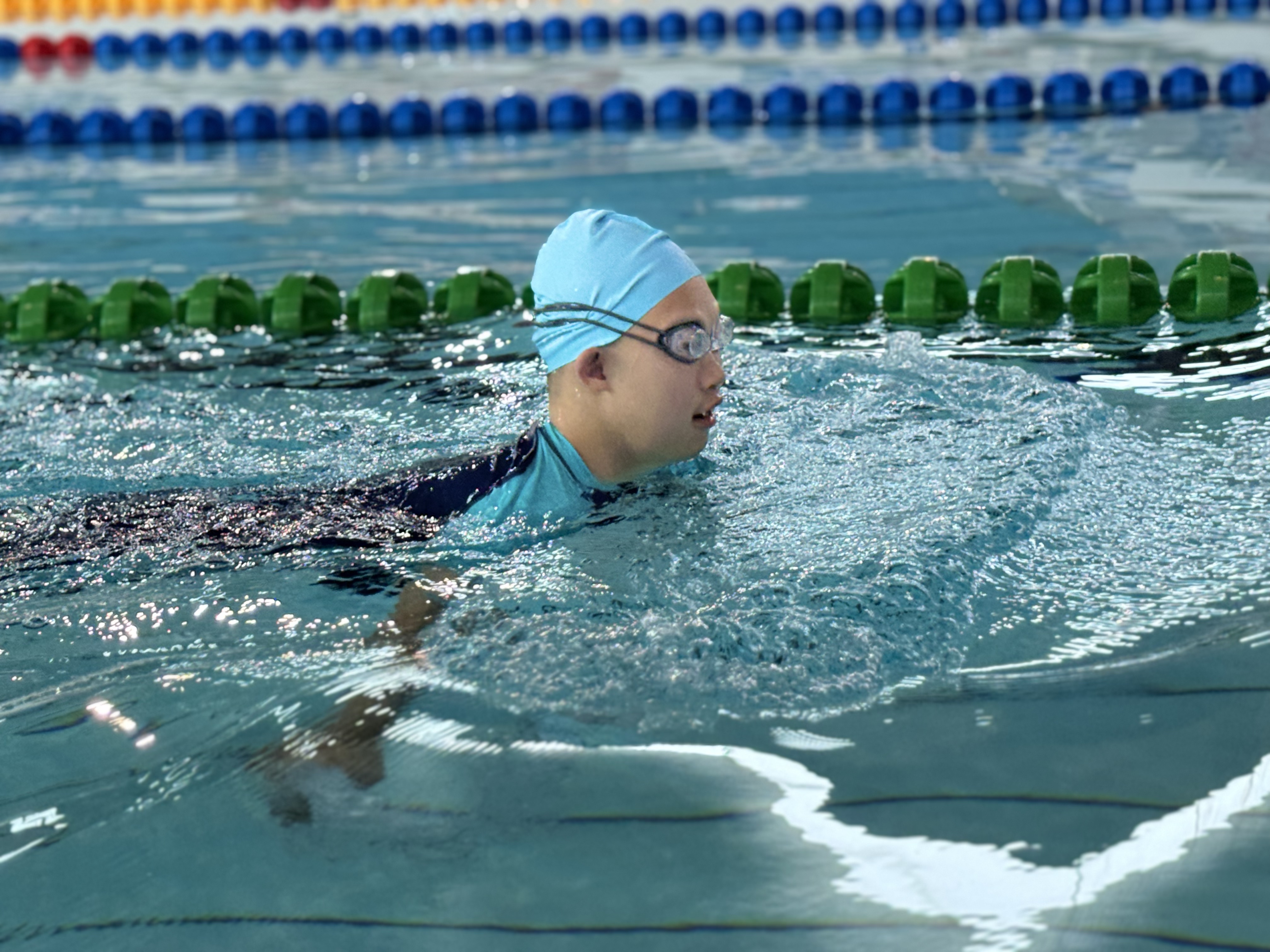 图为参与特奥游泳体验的孩子在专业教练指导下,沉浸式体验游泳活动