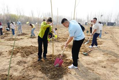 在植树造林科普讲解后,大家两人一组,分工协作,领取树苗和工具,按照“挖坑、回填、栽植、覆土、培坑、浇水”的标准流程,合力栽下一棵棵黄柳树苗。经过两个多小时的辛勤劳动,百余株新苗在春风中挺立,为生态园增添了一片生机。植树结束后,大家纷纷在寄语卡上写下美好祝愿,悬挂在树苗上,并合影留念。