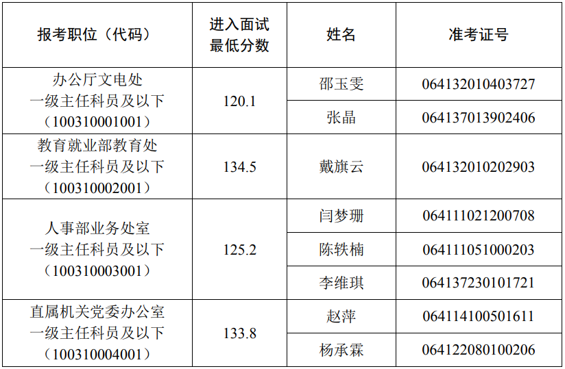 因部分考生放弃面试资格,根据公务员考录有关规定,在公共科目笔试合格的考生中,按照笔试成绩由高到低的顺序进行递补。递补人选名单如下(报考同一职位考生按准考证号排序):